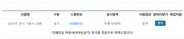 미용사(피부) 국가자격증 조기 원패스 합격을 진심으로 축하드립니다. 아임소울퍼스널뷰티 21-04-29 15:19 764 0 합격은 매일 반복하는 작은 노력의 결과입니다. 조기 원패스 합격을 진심으로 축하드립니다. 댓글목록 등록된 댓글이 없습니다. 이전 목록 다음